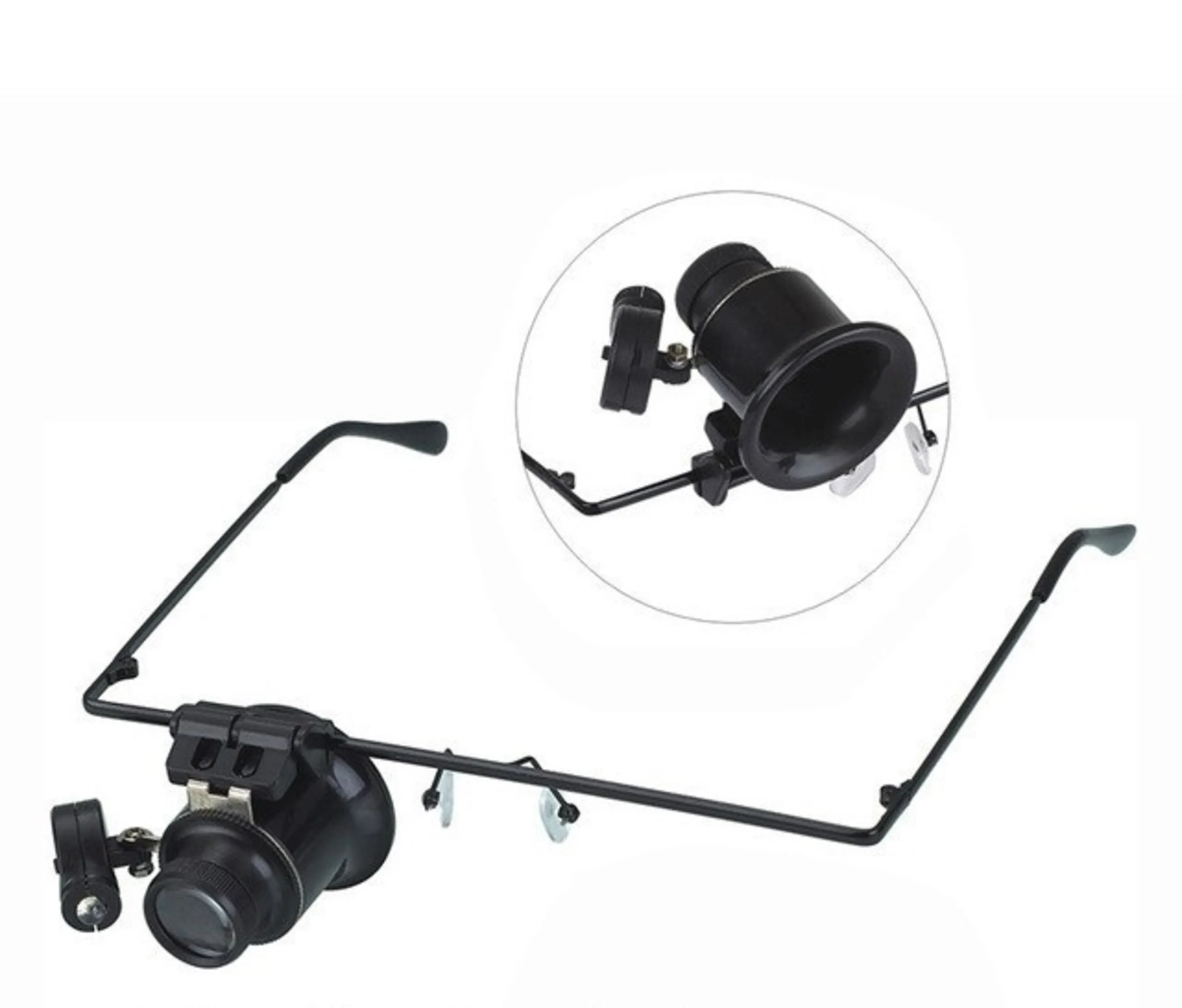 ذره بین عینکی دارای عدسی و لنز با زوم 20 برابر به همراه لامپهای LED روشن کننده به شکل عینک برای استفاده از ذره بین بدون نیاز به دستها و آزاد بودن دستها برای کارآیی و عملکرد بهتر در کارهای ریز و حساس